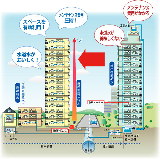 ビルやマンションなどの集合住宅では、今まで貯水槽を使って水をため、それを各部屋へ配水していました。